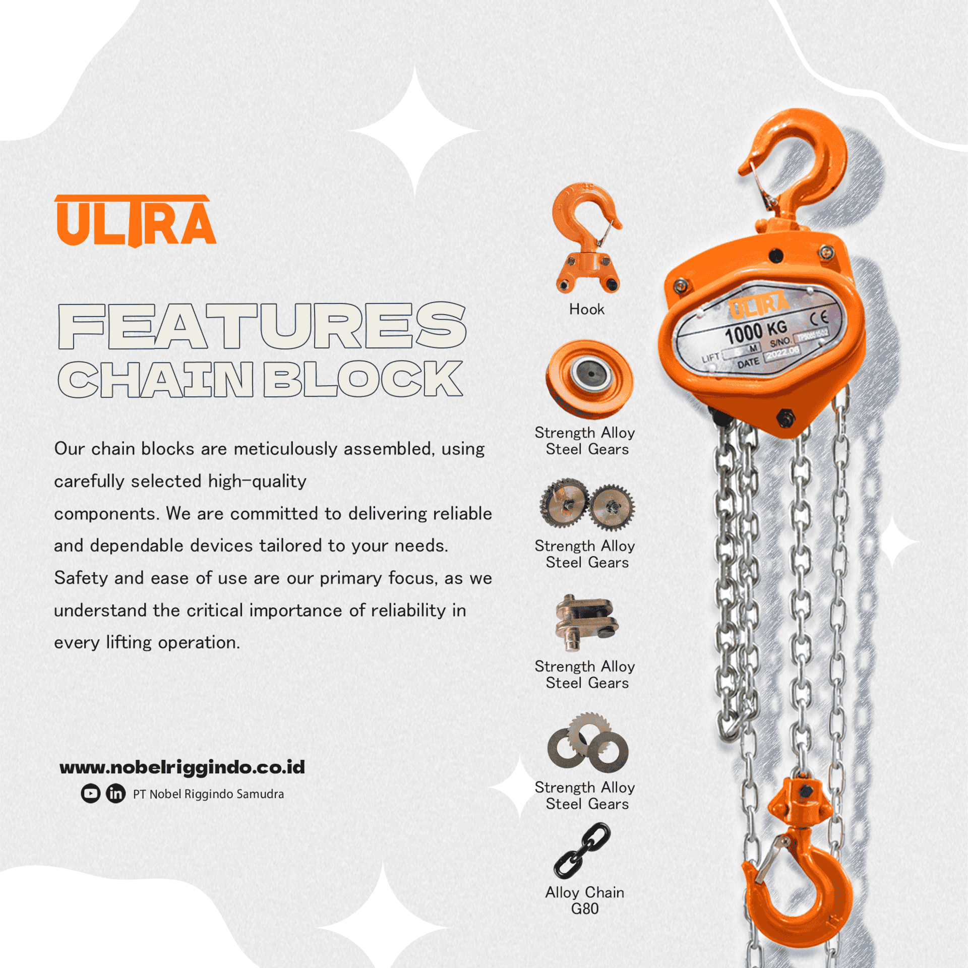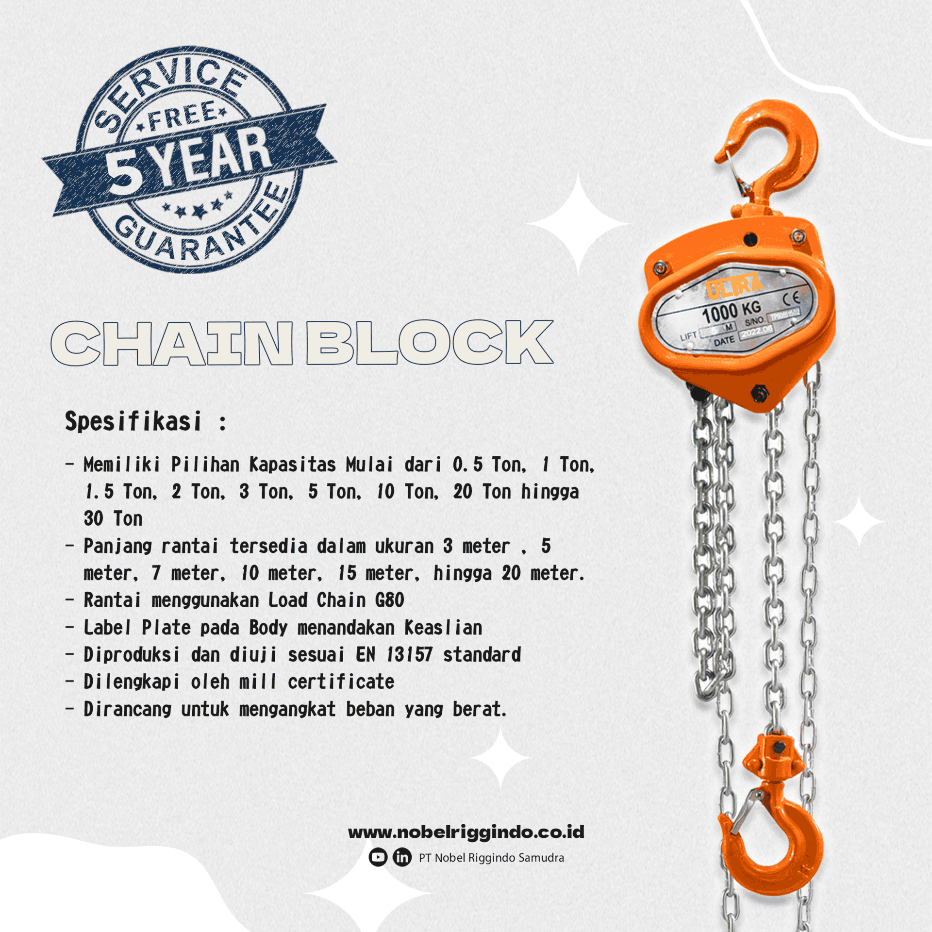 Chain Block memiliki fungsi untuk mengangkat beban berat. Perangkat ini sebenarnya adalah alat sederhana manual dengan komponen-komponen meliputi pengait (hook block), rantai baja (load chain), roda gerigi (gear), dan pulley (hand wheel). Chain Block dapat digunakan untuk beragam pekerjaan pengangkatan dengan beban mulai 0.5 ton hingga 30 ton.