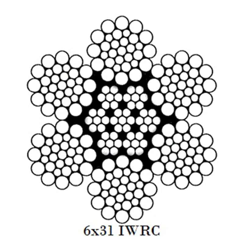 6×31钢丝绳是镀锌不锈钢和船用空气阻力中常用的柔性钢丝绳。 6×31钢丝绳具有相同的一般结构(warrington seale),其终端荷载比6×19结构更好。 6×31钢丝绳分别成FC(纤维芯)或IWRC(独立钢丝绳芯)。